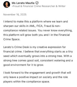 Lerato’s Crime Desk began in November 2025 as a simple newsletter on LinkedIn with no grand plan behind it. The more I learned about fraud and financial crime, the more I felt compelled to write about it and share it publicly.